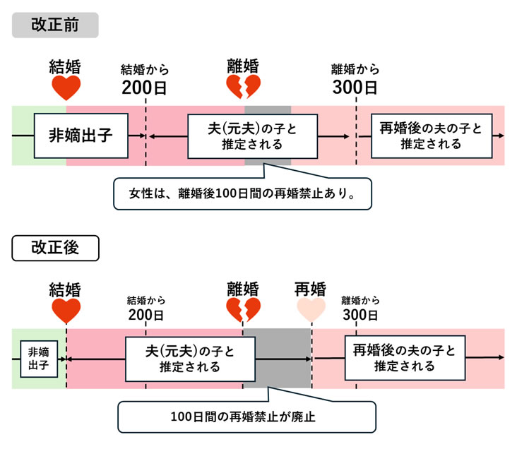 改正前の民法では、婚姻の成立日から200日を経過した後に生まれた子、または離婚などで婚姻を解消した日から300日以内に生まれた子を、夫の子と推定する仕組みとなっていました。