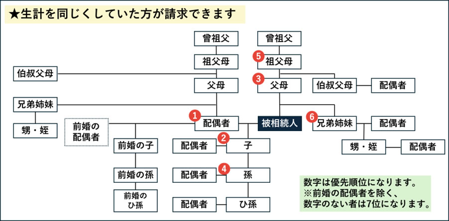 ただし、被相続人と生計を一にしていることや、先順位者がいないなど、請求者自身が条件を満たしているかどうかは別途確認する必要があります。